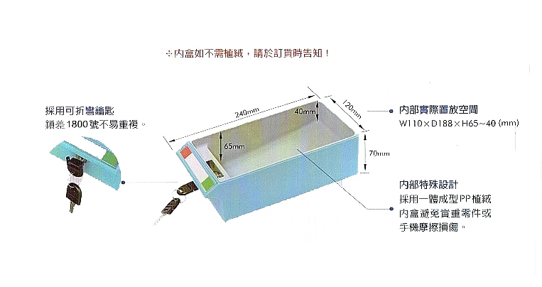 - 採用萬能鎖型,每台皆附鎖王一支,若使用者不慎遺失時,方便管理者迅速處理。